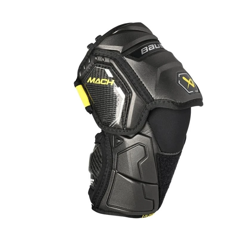 Der Bauer Ellenbogenschutz Supreme MACH überzeugt durch zahlreiche Features. Die neue, tiefsitzende EDL-Kappe bietet höchsten Komfort und maximale Beweglichkeit, während die Oberarm- und Unterarmkomponenten aus Curv Composite gefertigt sind, um eine perfekte Passform zu gewährleisten. Die Befestigung des Ellenbogenschutzes erfolgt über die Comfort Lockstraps, die einen sicheren Halt garantieren und gleichzeitig angenehm zu tragen sind.