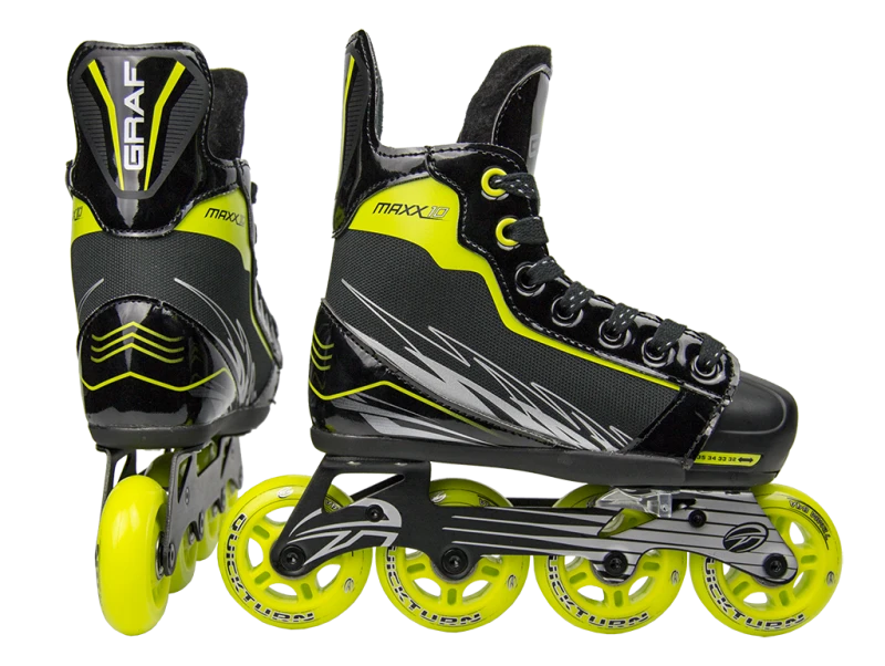 Der brandneue Graf Maxx10 Inlineskate ist ein echter Eyecatcher. Er ist perfekt geeignet für alle Inlinehockeyspieler. Und er wächst mit! Um vier Größen verstellbar: Der Maxx10 Inlinehockey Skate aus dem Hause Graf besteht aus Nylon Composite Obermaterial. Das Innenmaterial besteht aus Flex lining und atmungsaktivem Brush Nylon. Der Knöchelbereich wurde mit einer leichten Memory Schaum Knöchelpolsterung ausgestattet. Die Flex Zunge sorgt für guten Comfort, Schutz, Flex und verhindert das durchdrücken der Schnürsenkel. Das QuickTurn 2.0 Chassis hält den Schuh sehr leicht – für den absoluten Top-Speed.